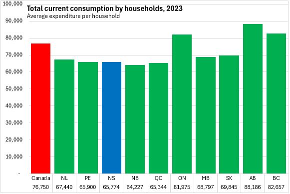 In 2023, Nova Scotian households made an average of $65,774 in expenditures for current consumption. This was 85.7% of the national average of $76,750. Average household current consumption in 2023 was highest in Alberta and lowest in New Brunswick.