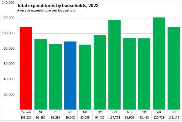 Including tax, insurance, pension, support payments and giving (which are not part of current consumption), Nova Scotia household expenditures averaged $89,542 in 2023 (82.7% of the national average). National household expenditures averaged $108,225 with the highest spending in Alberta and the lowest spending in New Brunswick.