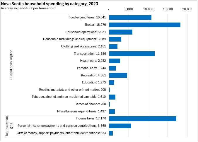 The largest expenditure items in Nova Scotia were shelter (including energy and insurance), income taxes, transportation and food purchased from stores.
