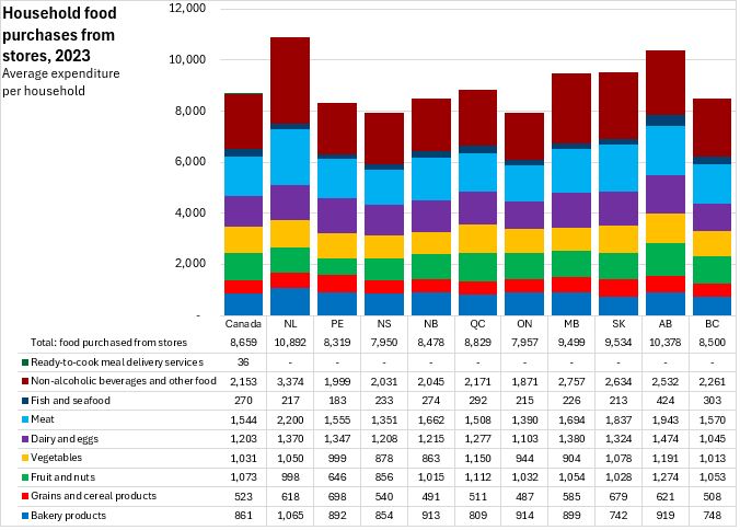 Compared with other provinces, Nova Scotia had the lowest average purchases of food from stores in 2023 at $7,950 per household, just behind Ontario. The largest specific components of food purchased from stores were meat and dairy/eggs, which was consistent across provinces.