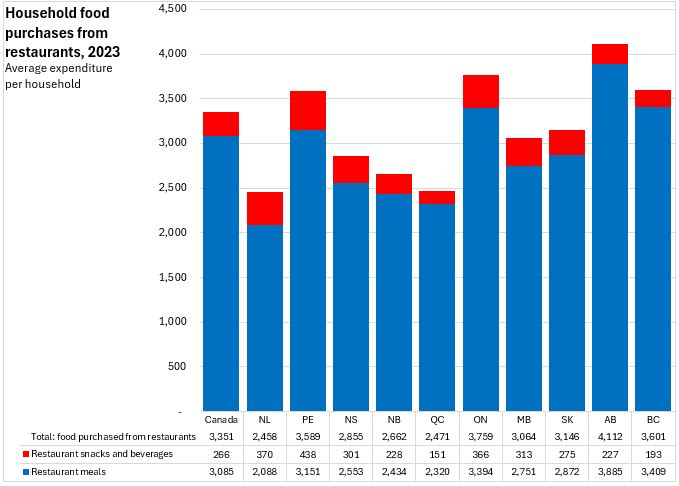 Nova Scotians purchased an average of $2,855 in food from restaurants in 2023, which was below the national average. The bulk of these purchases were for meals (as opposed to snacks and beverages).