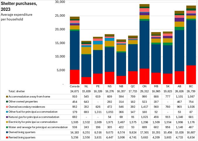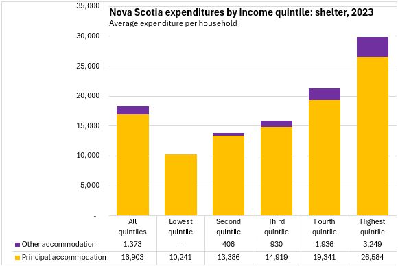Shelter expenditures averaged $18,276 among Nova Scotia households in 2023. This was 74.1% of the national average. Owned and rented living quarters as well as electricity were the largest items in shelter expenditures.