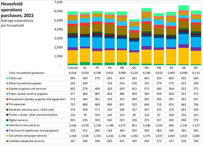 Household operation expenditures averaged $5,921 in Nova Scotia in 2023 - just below the national average ($6,014). The largest items in household operations expenditures were cell phone service, internet service, and pet expenses.