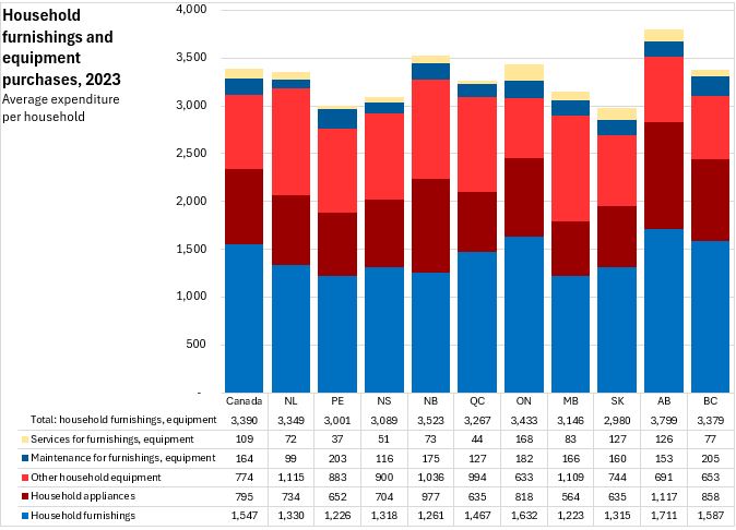 Household furnishing and equipment expenditures averaged $3,089 per household in Nova Scotia in 2023, below the national average. Only households in Prince Edward Island spent less than Nova Scotians on furnishings, appliances and household equipment/services. Expenditures on household furnishings, equipment and appliances were notably higher in Alberta.