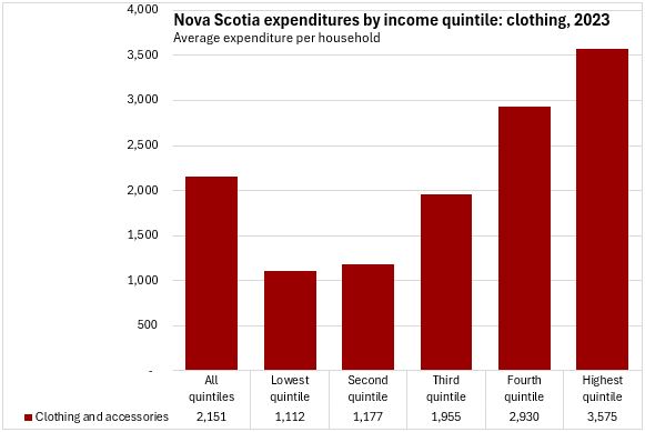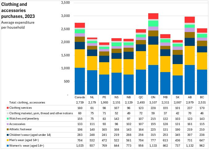 Nova Scotian households spent an average of $2,151 on clothing, footwear and accessories, well below the national average ($2,739). Clothing was the largest component of this expenditure. Ontario and Alberta reported notably higher expenditures on clothing, footwear and accessories in 2023.
