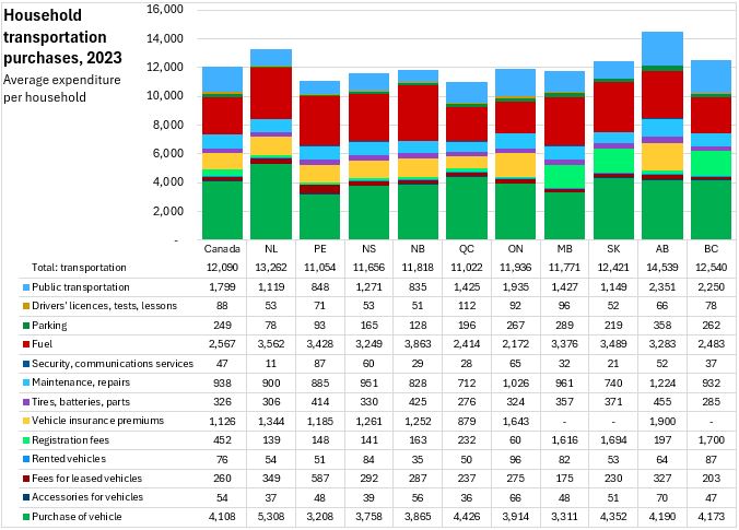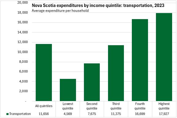 Nova Scotians' transportation expenditures averaged $11,656 per household in 2023, above only Prince Edward Island and Québec. This was below the national average of $12,090 in 2023.