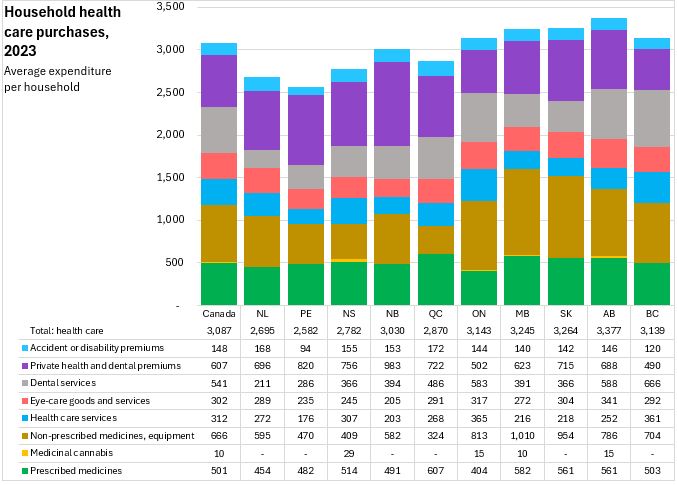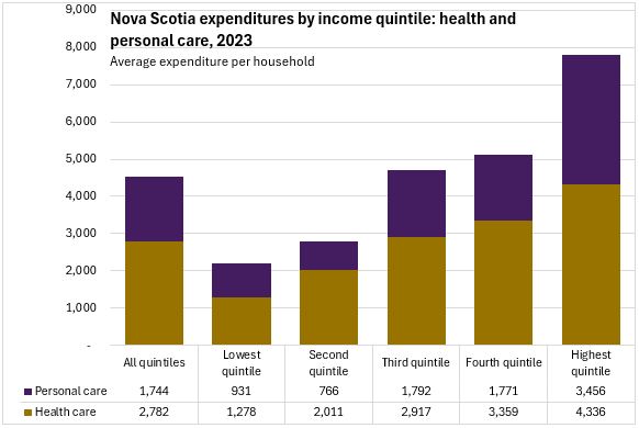 Nova Scotians' average household expenditures on health care were $2,782 in 2023, which was below the national average. Health insurance was the largest component of this expenditure, followed by prescription and non-prescription medicines, and dental services.