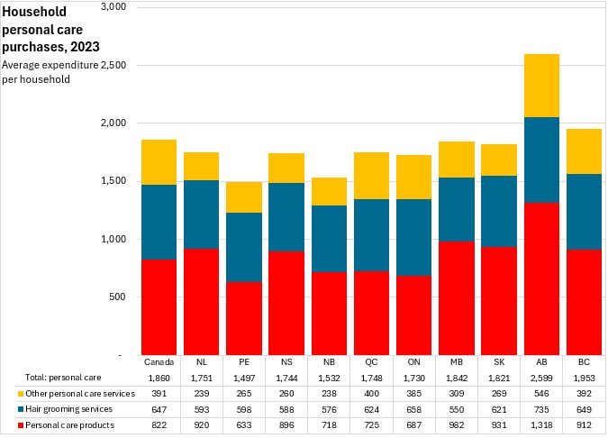 Personal care purchased averaged $1,744 per household in Nova Scotia in 2023, below the national average. The largest expenditure category was personal care products, followed by hair grooming services. Alberta reported the highest average household spending on personal care.