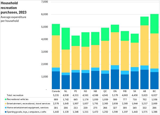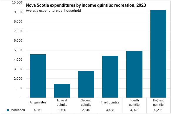 Average household expenditures on recreation were $4,581 in Nova Scotia. The largest items of recreational expenditure were for: entertainment, recreational and travel services, followed by sporting goods, toys, computers and crafts.