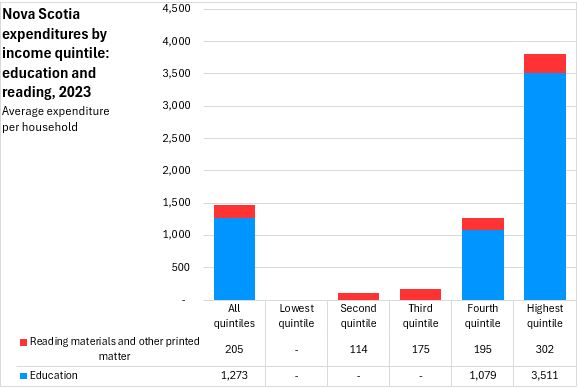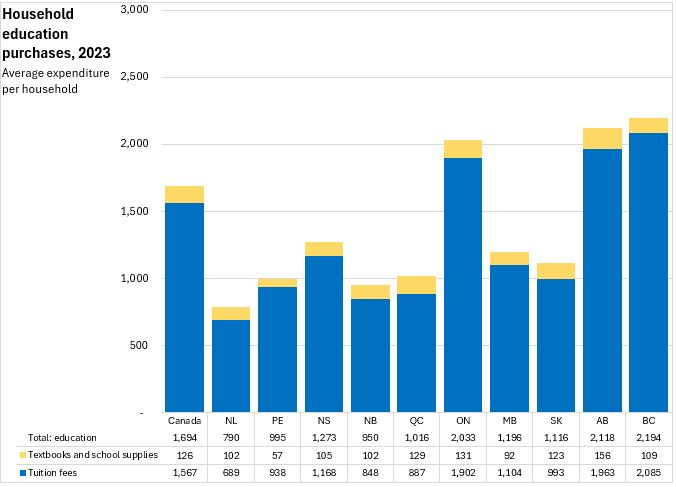 Nova Scotian households spent less ($1,273) than the national average on education but more than the other Atlantic provinces. The bulk of these expenditures were on tuition costs. Education expenditures, including tuition, were notably higher in Ontario, Alberta and British Columbia.