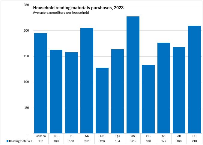 Nova Scotian households spent more on reading materials per household than the national average ($205 vs $195). This was also the highest among Atlantic provinces.
