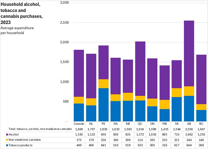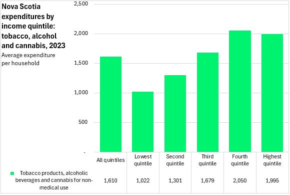 Average household expenditures on alcohol, tobacco, and non-medicinal cannabis were $1,610 in 2023, which was below the national average. Although Nova Scotians spent less than the national average on alcohol and non-medicinal cannabis, there were higher than average expenditures in Nova Scotia on tobacco products.