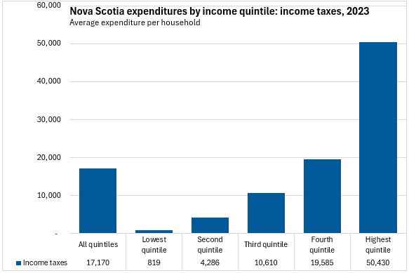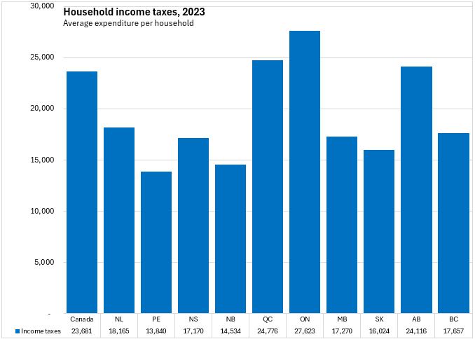 Nova Scotian households paid an average of $17,170 in income taxes in 2023. Income taxes paid were highest in Ontario, Québec and Alberta and the lowest in Prince Edward Island and New Brunswick.