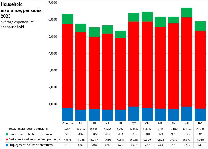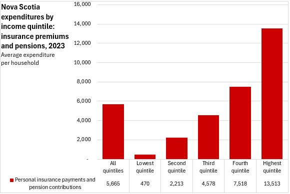 Nova Scotians' average household expenditures on insurance and pensions were $5,665 in 2023, which was below the national average. Retirement/pension savings were the largest expenditure category.