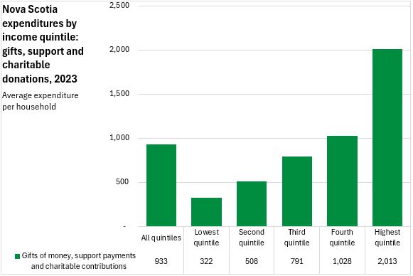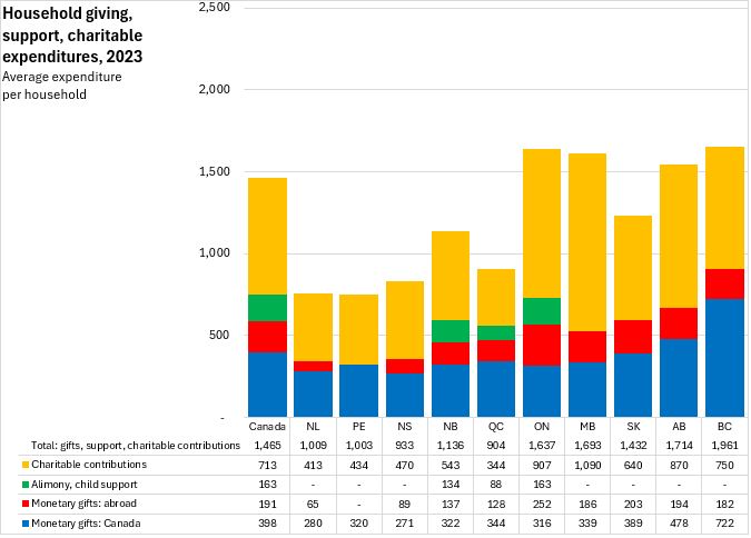 Average household expenditures on charitable contributions, monetary gifts and child support payments were lower in Nova Scotia compared to the national average. Note that average child support payment per household are suppressed in most provinces.