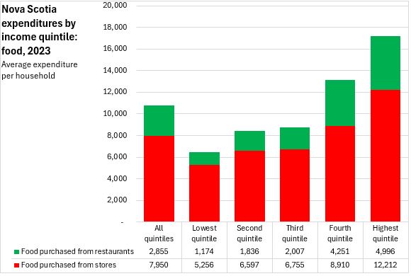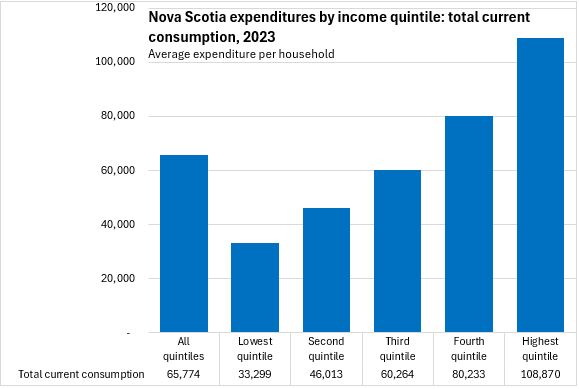 Statistics Canada also reports average household expenditure by income quintile. As income increases, consumption spending typically also increases. Households in the highest income quintile in Nova Scotia reported spending an average of $108,870 in current consumption compared to $33,299 in the lowest quintile.