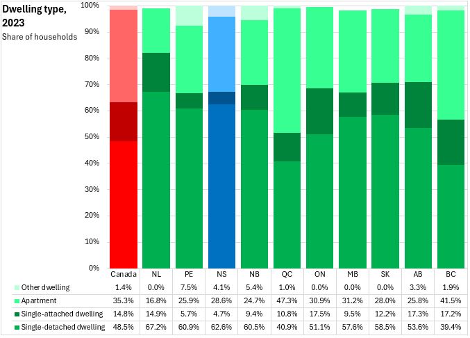 The 2023 Survey of Household Spending found that 62.6% of Nova Scotians lived in a single-detached dwelling while a further 28.6% lived in an apartment style dwelling.