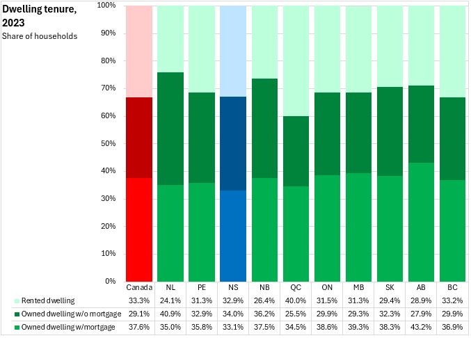 Just over 67% of Nova Scotian households owned their dwelling while 32.9% were renters in 2023. A slightly larger portion of Nova Scotia households (34.0%) were without mortgages on their owned dwelling than the share that owned their dwelling with a mortgage (33.1%).