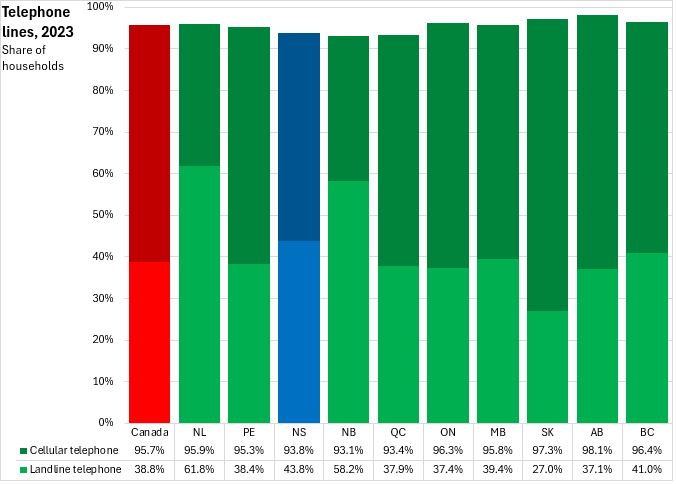 Landline telephone service was less common than households with a cellphone. Over 95% of households nationally had cellular phones while less than 40% of Canadian households had landline telephone service. In Nova Scotia, 43.8% of households had landlines (which were more prevalent in Atlantic Canada).