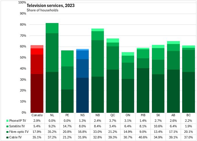 In 2023, 31.9% of Nova Scotia households had cable television. A further 16.8% received television service through fibre-optic, and 9.3% received television service through phone or satellite.