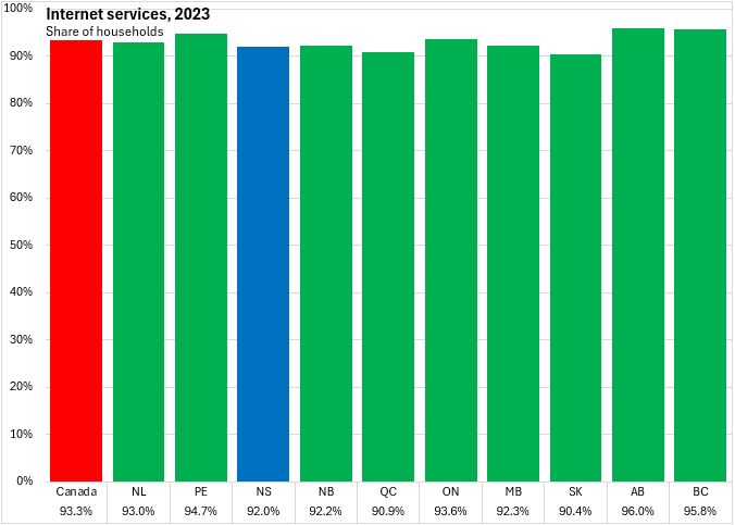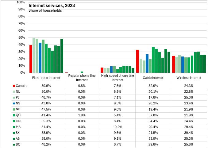 In 2023, 92.0% of Nova Scotia households had internet access. Fibre-optic service (43.0%), cable (26.2%) and wireless (23.4%) were the most common forms of internet access in Nova Scotia. Internet access was available at 93.3% of Canada's households.