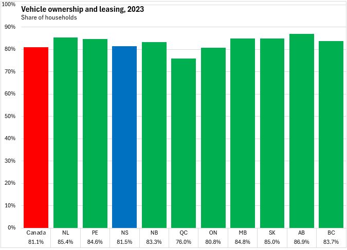 Across Canada, 81.1% of households owned, leased or otherwise operated a vehicle in 2023 including 75.9% who owned a vehicle. The share of Nova Scotia households with a vehicle was higher (81.5%), with 76.1% owning a vehicle. The share of Nova Scotia households that owned 2 or more vehicles was 35.9%, which was above the national average (34.3%).