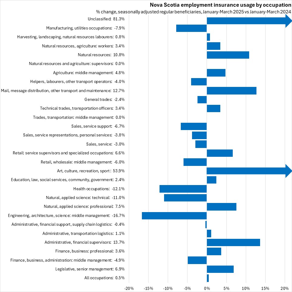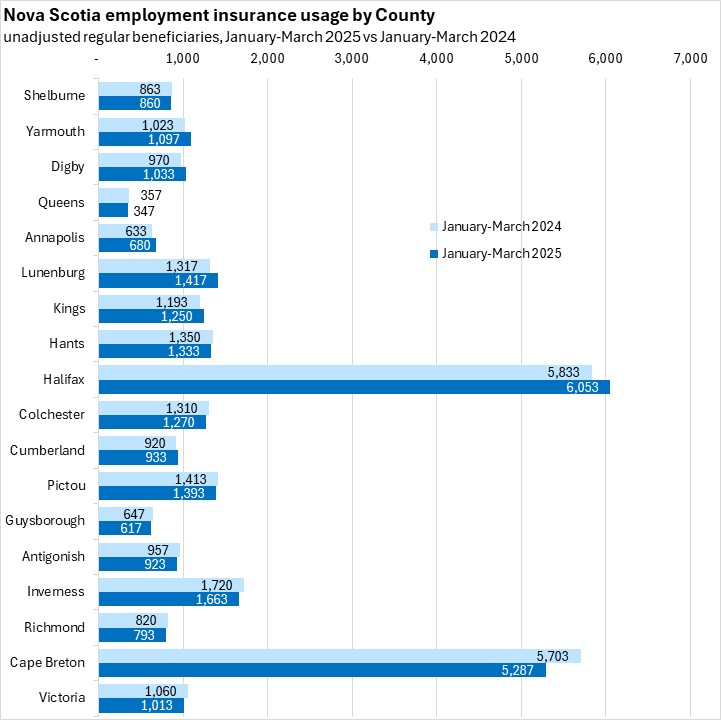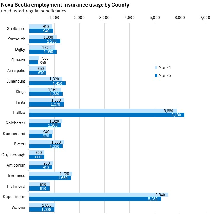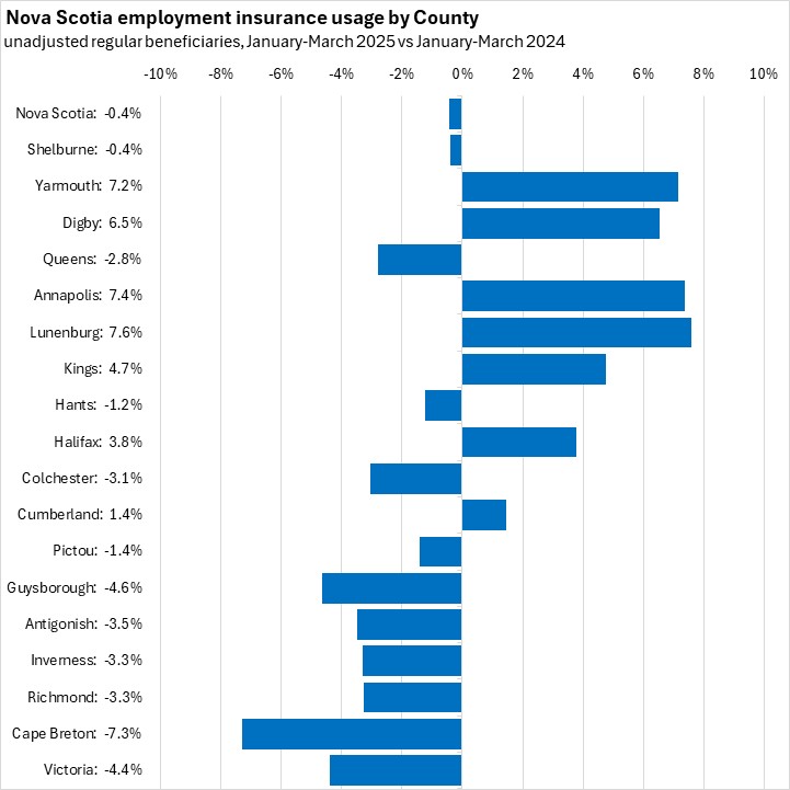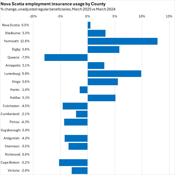 Comparing unadjusted regular beneficiaries for March 2025 against March 2024, employment insurance usage declined the most in Queens, Cape Breton, and Colchester counties (in percentage terms). Employment insurance usage increased the most in Yarmouth and Lunenberg counties.