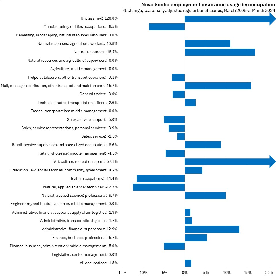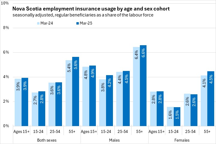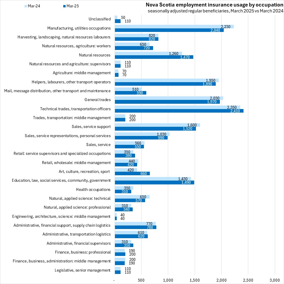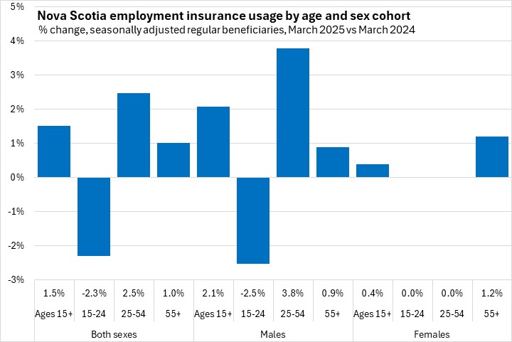 Compared to March 2024, Nova Scotia's employment insurance usage rose 1.5% (+330). National employment insurance usage increased 6.0% compared to March 2024. Seven provinces reported higher employment insurance compared to one year ago, with the fastest rise in Ontario. Three provinces reported lower employment insurance usage, with the fastest decline in Newfoundland and Labrador, followed closely by Saskatchewan.