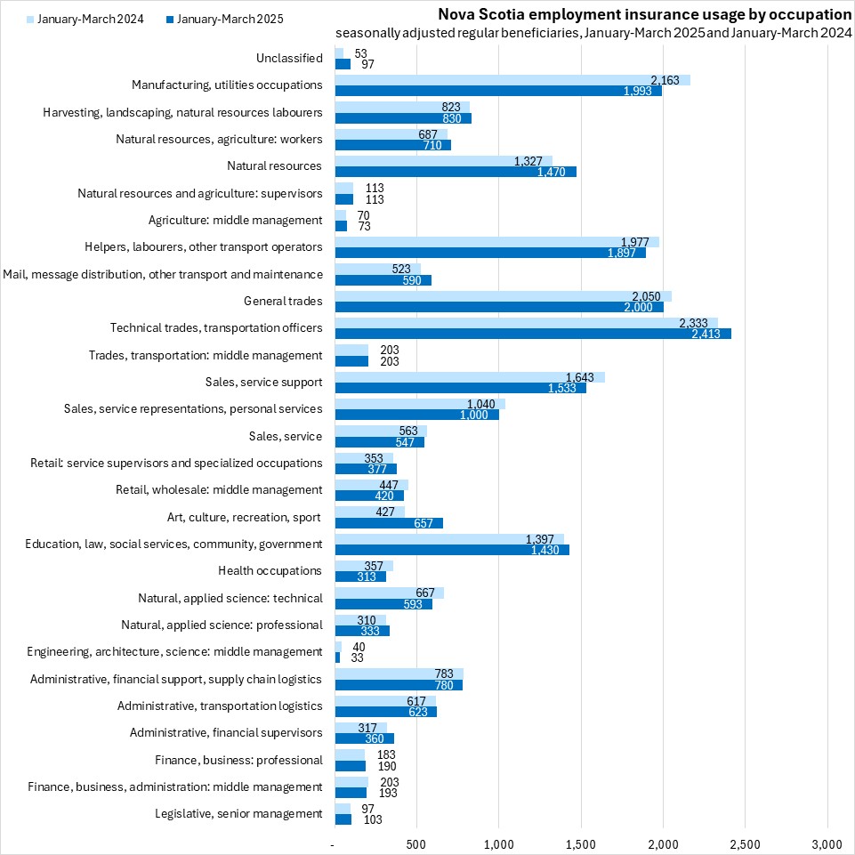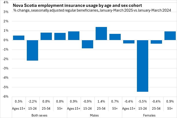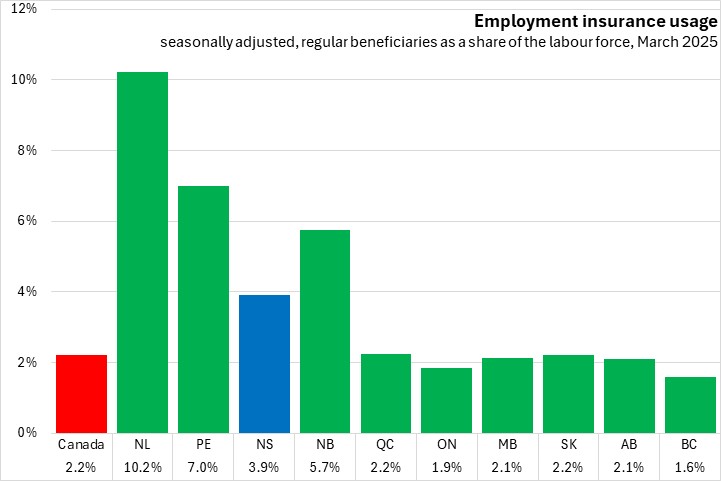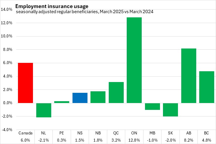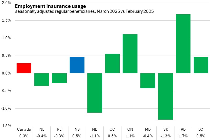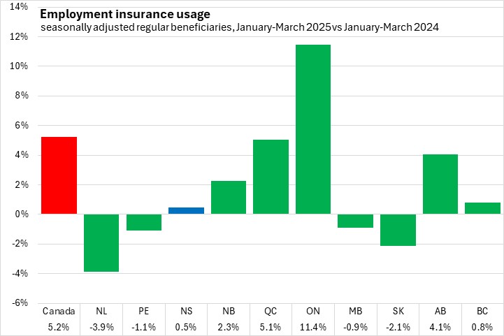 Compared to the first two months of 2024, Nova Scotia's employment insurance usage increased 0.5%. National employment insurance usage increased 5.2% compared to January-March 2024. Six provinces reported higher employment insurance compared to one year ago, with the fastest increase in Ontario. Four provinces reported lower employment insurance usage, with the fastest decrease in Newfoundland and Labrador.
