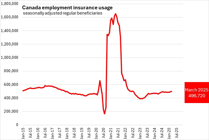 There were 496,720 Canadians that received regular employment insurance benefits in March 2025 (seasonally adjusted), an increase of 1,410 (+0.3%) from February 2025.