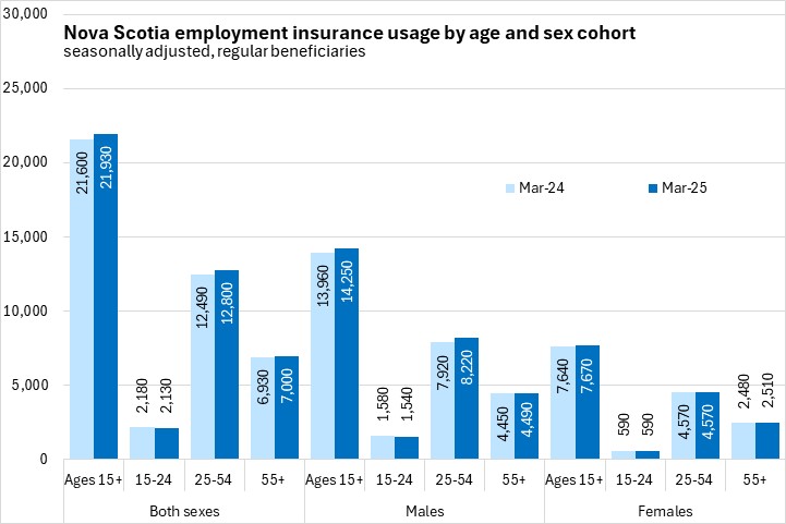 In March 2025, there were 21,930 Nova Scotians in receipt of regular employment insurance benefits (seasonally adjusted). Nova Scotia's seasonally adjusted regular employment insurance usage increased by 100 (+0.5%) from February to March.