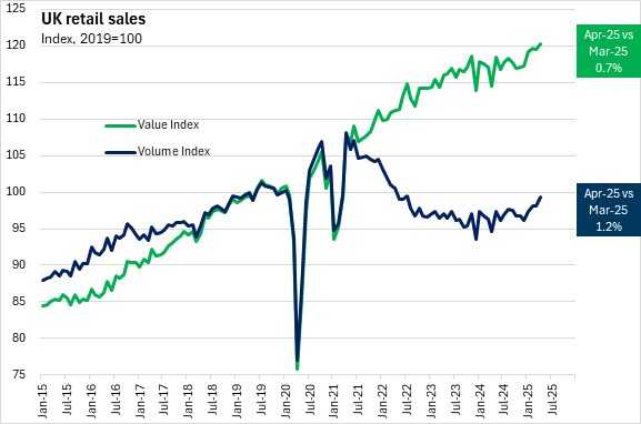 UK retail sales values grew by 0.7% while volumes (adjusted to remove the effects of price changes) were up 1.2%.