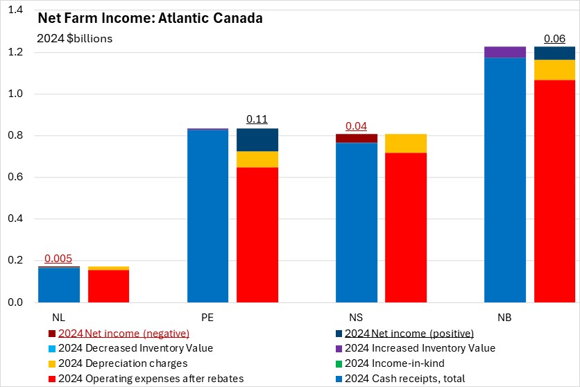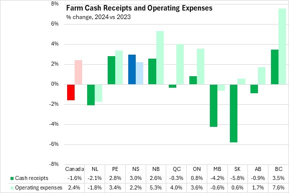 In Nova Scotia, farms reported net loss of $41.7 million on cash receipts of $764.1 million. Nova Scotia farm cash receipts were up 3.0% while operating expenses (after rebates) rose by 2.2%. Nova Scotia's net farm income has been negative for eight consecutive years.