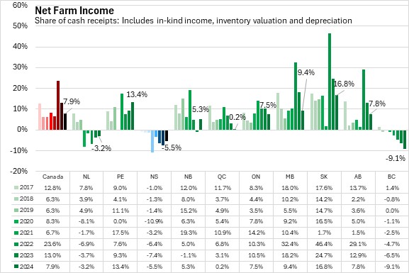 Nova Scotia farm net incomes amounted to -5.5% (loss) of farm cash receipts in 2024, narrowing from a loss of 7.4% of farm cash receipts in 2023. There was negative net farm income for 2024 in Newfoundland and Labrador, Nova Scotia and British Columbia. Both Newfoundland and Labrador and British Columbia have reported negative net farm incomes in each of the last five years.
