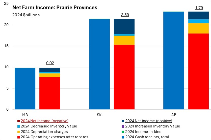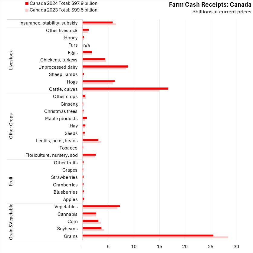 Net farm income in Canada was $7.7 billion on farm cash receipts of $97.9 billion in 2024. Canadian farm cash receipts were down by 1.6% while operating expenses (after rebates) grew by 2.4%. Canadian net farm income was $13.0 billion in 2023.