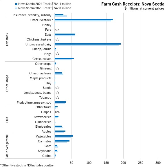 In Nova Scotia, dairy products make up the largest cash receipts (though poultry and hogs are not reported individually for Nova Scotia and are reported in the substantial 'other livestock' category). Among crops, vegetables, cannabis, blueberries and apples make up the largest cash receipts.
