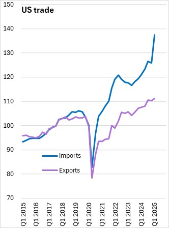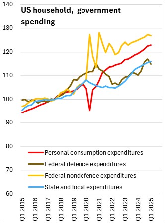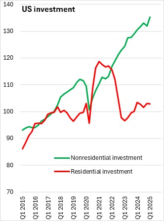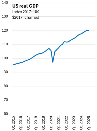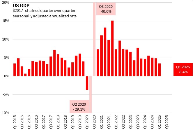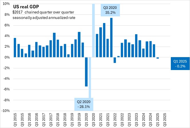 US real GDP growth was estimated at -0.2% (seasonally adjusted annualized rate) for Q1 2025 in the revised estimate. This remained the first quarterly contraction since Q1 2022.