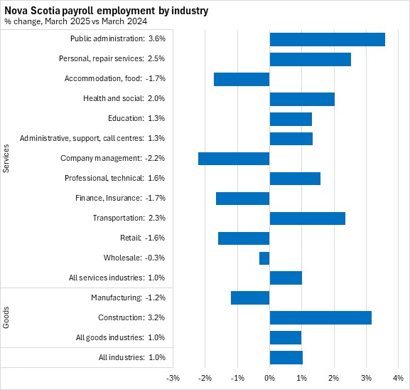 Public administration had the fastest year-over-year growth in payroll employment in Nova Scotia, followed by construction. Company management, accommodation/food services, and finance/insurance reported the largest percentage declines in payroll employment.