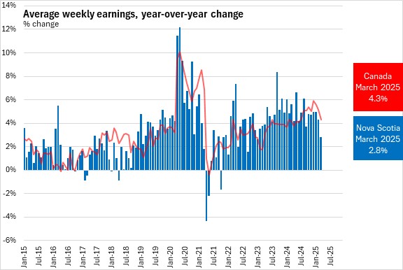 Average weekly wages grew by 2.8% in Nova Scotia from March 2024 to March 2025. This was slower than the national pace of 4.3%.