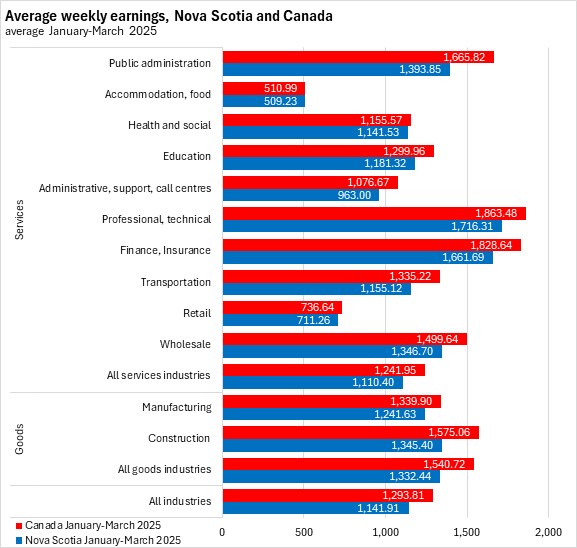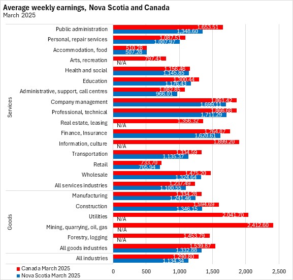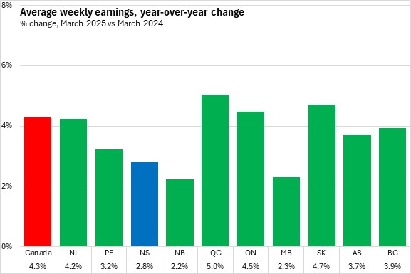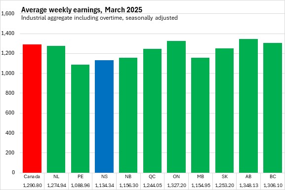 Nova Scotia's average weekly earnings in March 2025 were second lowest among provinces, ahead of Prince Edward Island. Alberta reported the highest average weekly earnings.