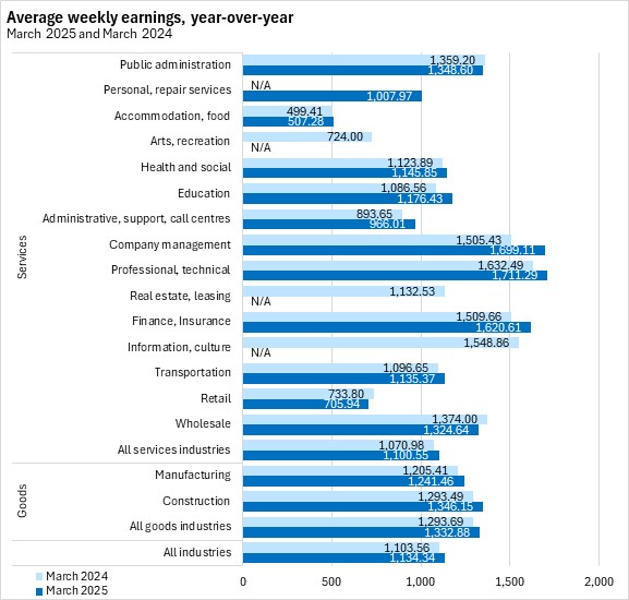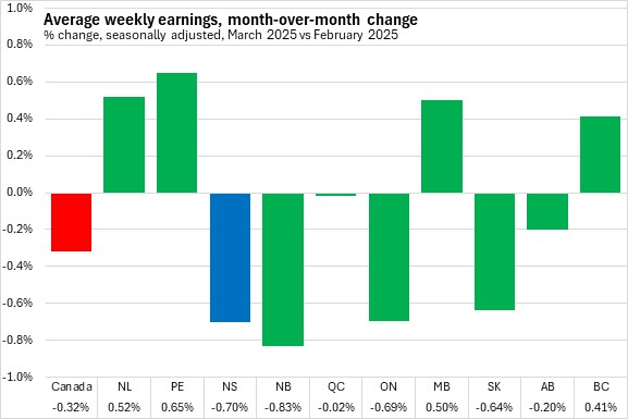 Nova Scotians' average weekly earnings were $1,134.34 in March 2025, a decline of $8.03 (-0.7%) from February 2025.
