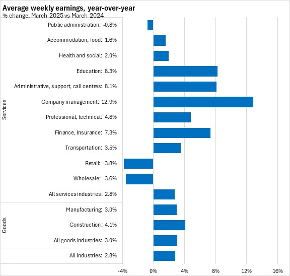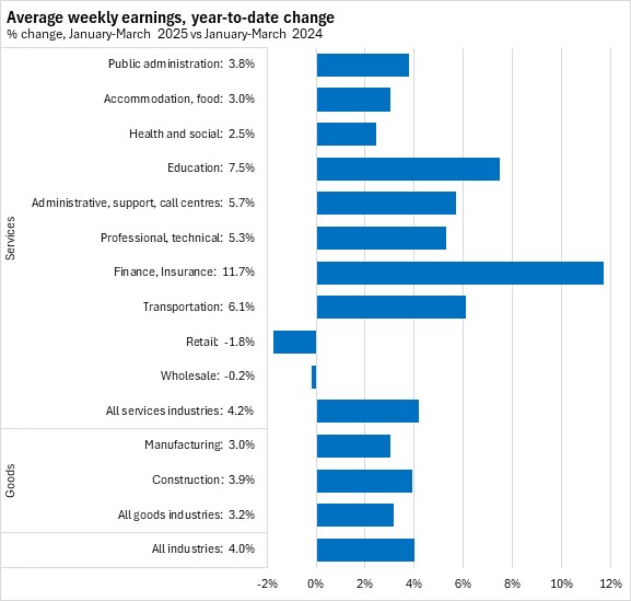 Average weekly wages grew by 4.3% across Canada from March 2024 to March 2025. There were gains in each province, with the fastest increase in Québec. New Brunswick and Manitoba reported the slowest gains.