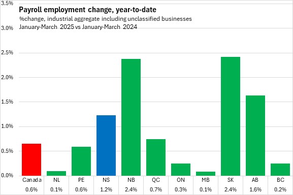In the first three months of 2025, Nova Scotia's payroll employment increased 1.2%. This was faster than the national average of 0.6% as all provinces reported growth. The fastest year-to-date growth was reported in Saskatchewan and New Brunswick and the slowest in Newfoundland and Labrador and Manitoba.