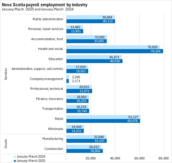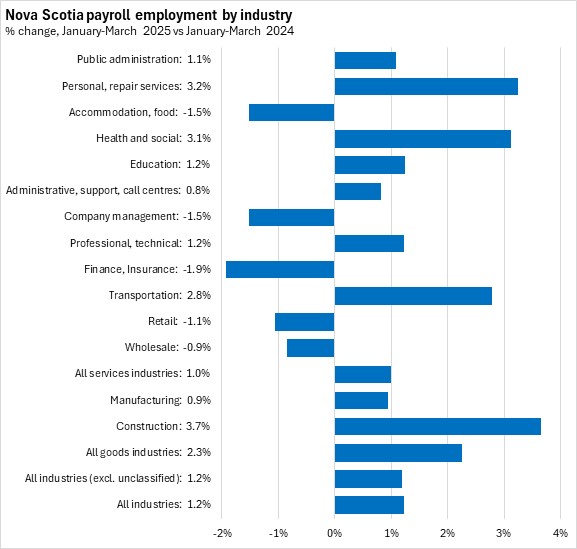 Construction, personal/repair services, health care/social assistance, and transportation reported the fastest growth in payroll employment in the first three months of 2025 in Nova Scotia. The fastest declines were reported in finance/insurance, accommodation/food services and company management.