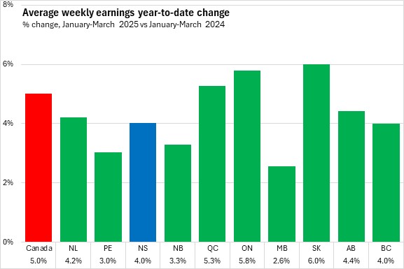 In January-March 2025, average weekly earnings grew 4.0% in Nova Scotia compared to the same period last year. National average weekly earnings grew 5.0% with all provinces reporting growth over this period. Saskatchewan reported the fastest growth while Manitoba reported the slowest.