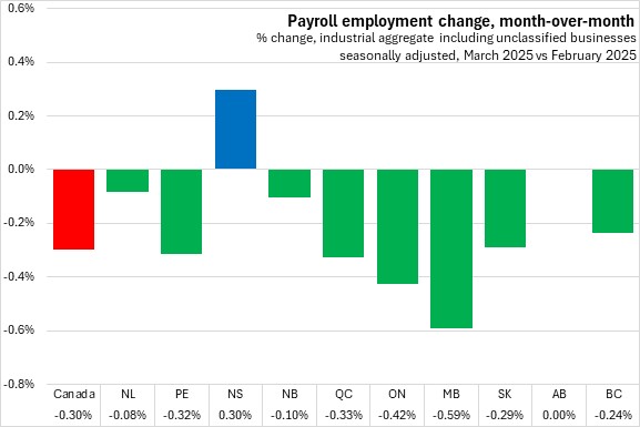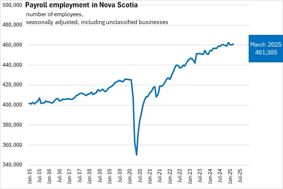 Nova Scotia had 461,385 payroll employees in March 2025, up 0.3% (+1,358) compared to February 2025, the only gain among provinces. Canada had 18.19 million employees, down 0.3% from February 2025. There were declines in eight provinces, led by Manitoba. Payroll employment was unchanged for Alberta.