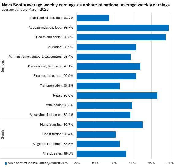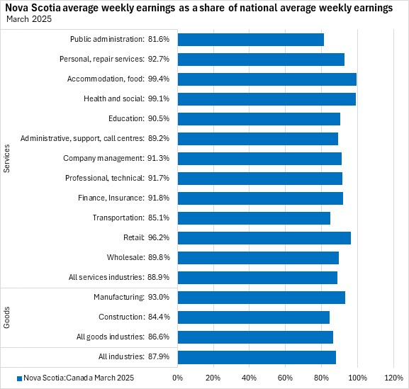 In March 2025, Nova Scotia's average weekly wages were 87.9% of the national average. Nova Scotia average weekly wages were below the comparable national average for every industry. The smallest gaps were reported among accommodation/food services and health/social assistance. The largest gap was reported in public administration (81.6% of the national average).