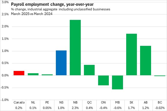 Compared with the same month in 2024, Nova Scotia's payroll employment grew by 1.0% (+4,678) in March 2025. This was faster than the national average gain of 0.2%. Seven provinces reported growth in payroll employment with the fastest gain in New Brunswick. The fastest decline was reported in Manitoba.