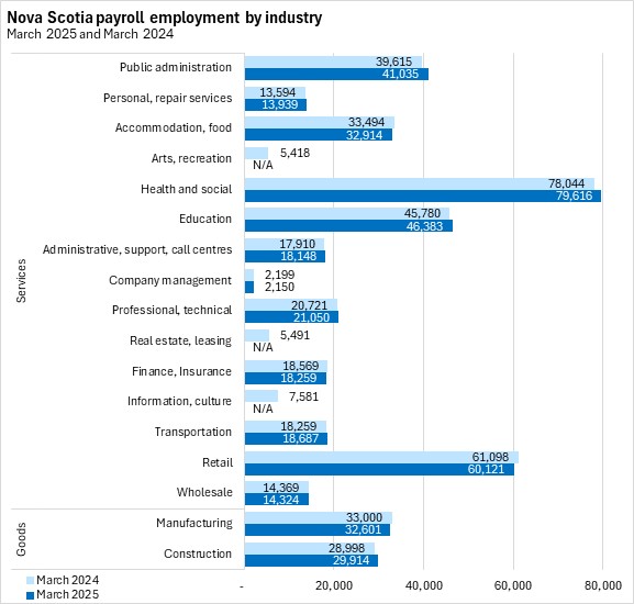 (Note: data are not available for Nova Scotia's utilities and mining sectors, and were not available in March 2025 for: forestry/logging, information/culture, real estate/rental/leasing, and arts/entertainment/recreation.)
