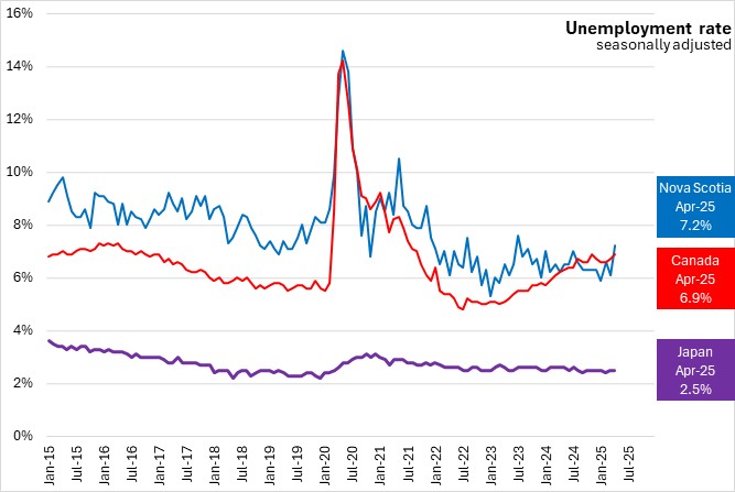 Japan's unemployment rate has been stable since 2022, with slow growth in both labour force and employment in the end of 2024; a slight decline followed in 2025. In contrast, Canada and Nova Scotia have experienced faster growth in both labour force and employment, but also with a rising trend in unemployment rates since 2022. Nova Scotia's unemployment rate has been more volatile with unemployment going up in recent months.